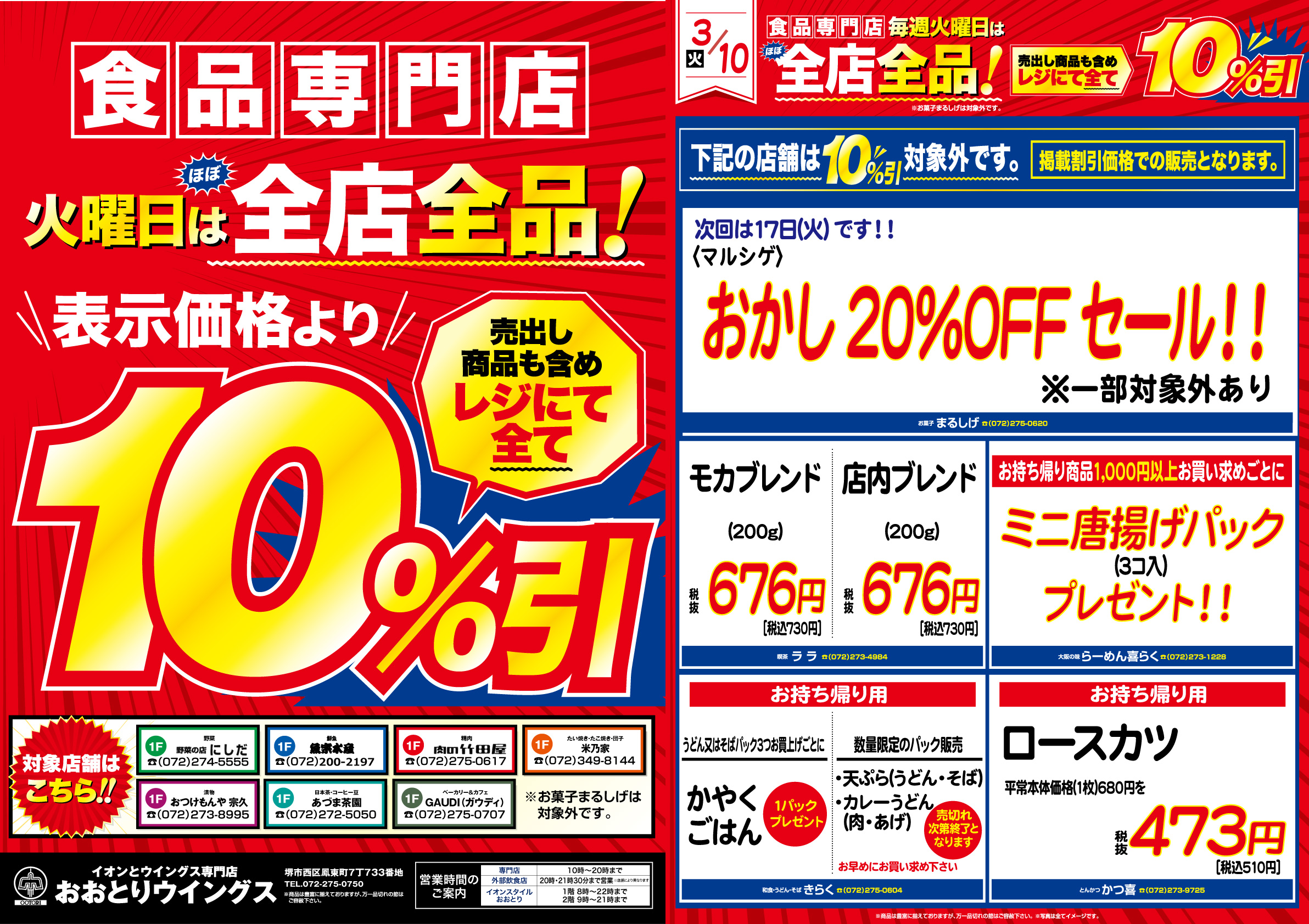 営業時間:10:00~20:00 TEL:072-275-0750 外部飲食店は20:00・21:30まで ※店舗により異なります。
